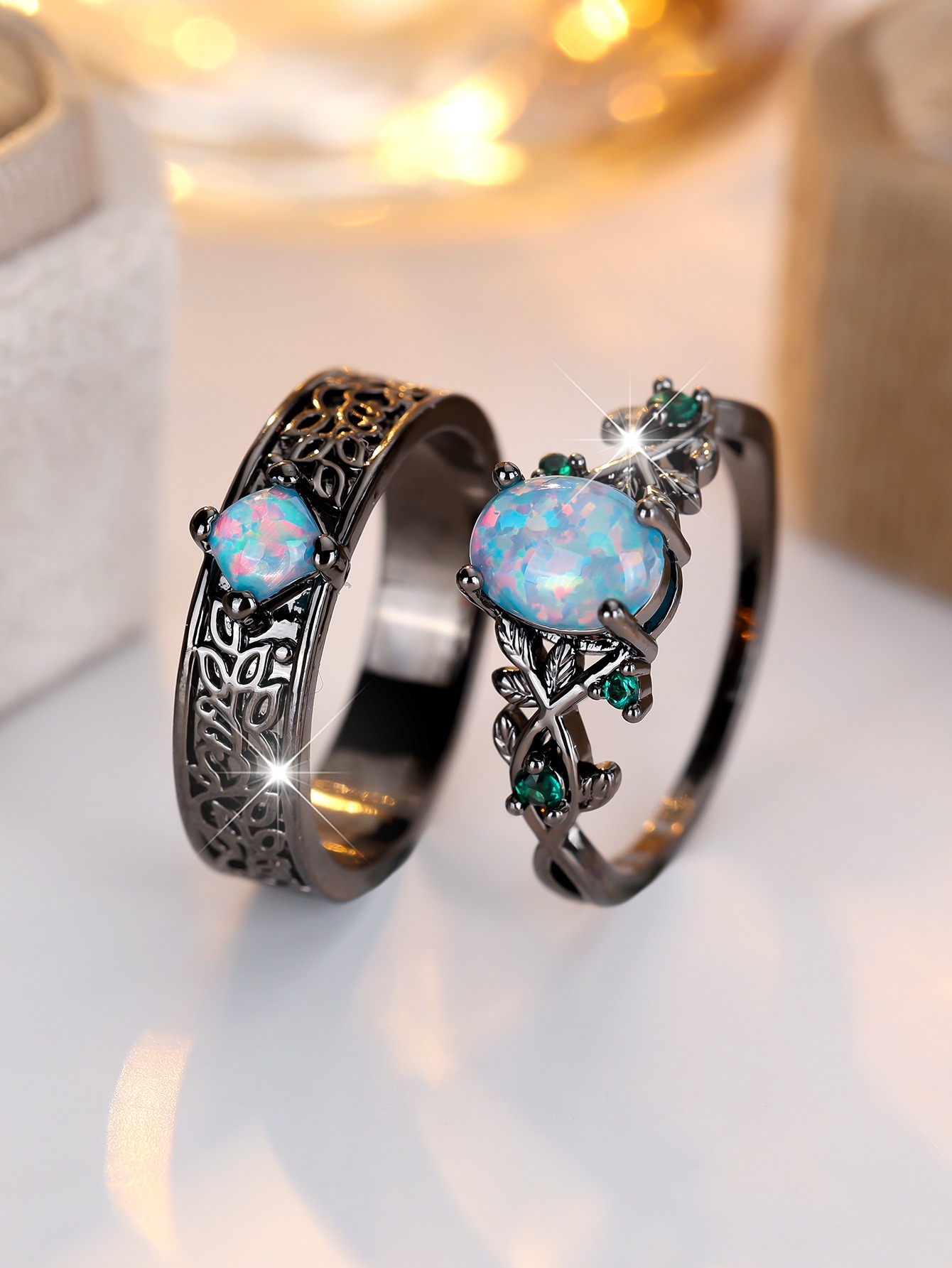 Black-Plated Opal/Stardust Couple Ring Set|Two-Tone Gemstone Options + Vine & Scrollwork for Every Moment of Lasting Companionship