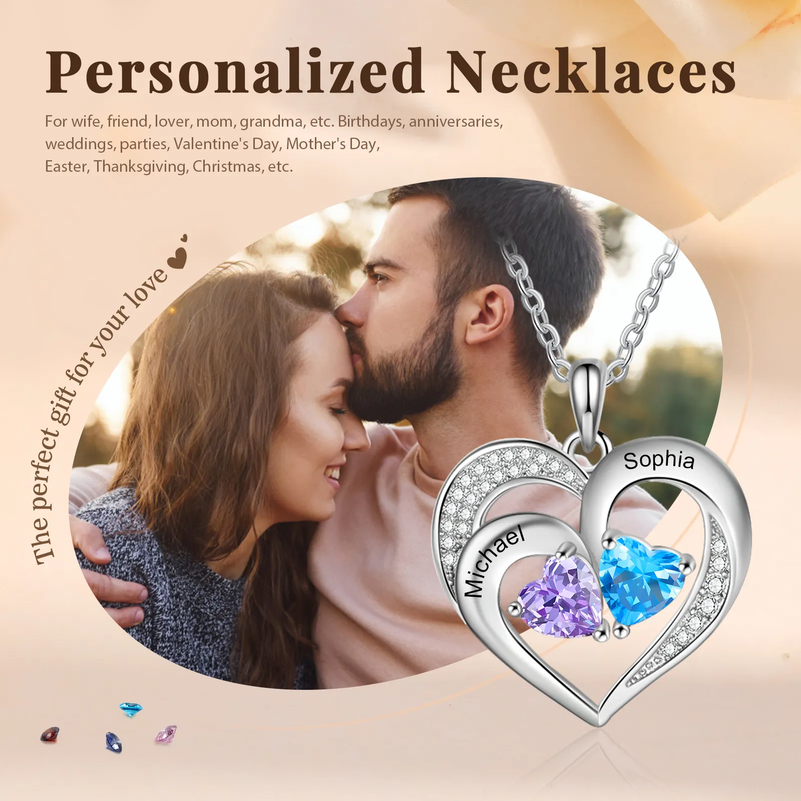 Personalisierte Herz-Halskette mit 2 Namena und 2 Herz-Geburtssteinen
