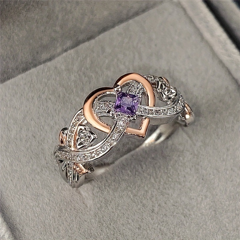 Rose Gold Heart Shaped Amethyst Ring - Women's Light Luxury Romantic Diamond-Encrusted Accessory