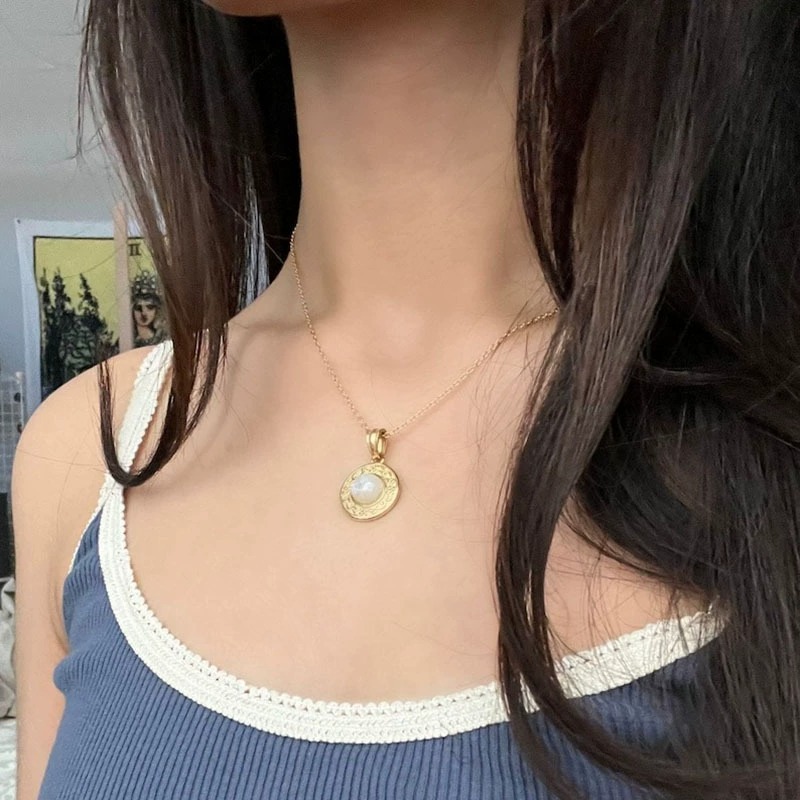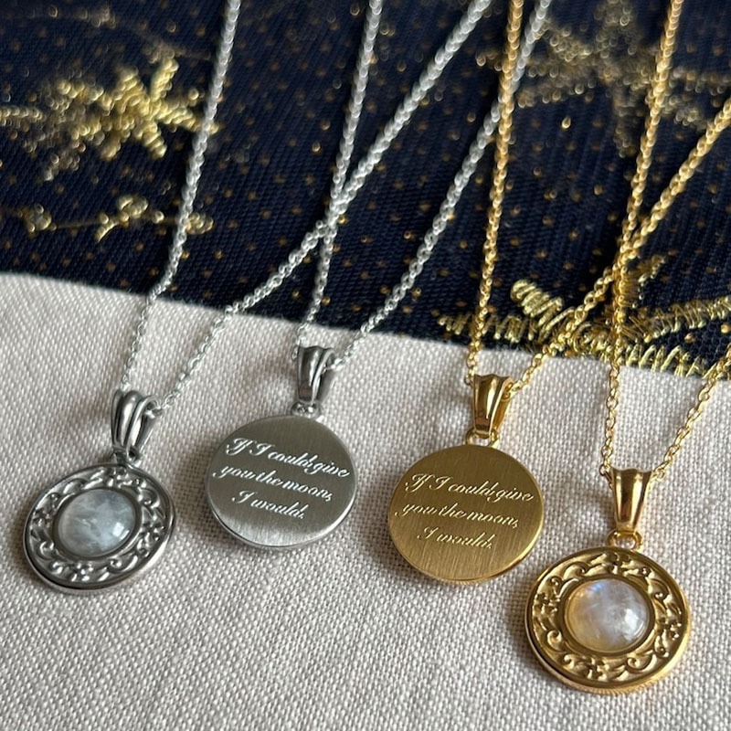 S925 Silver Plated 18K Gold Light Luxury Couple Dual-Color Moonstone Engraved Disk Necklace