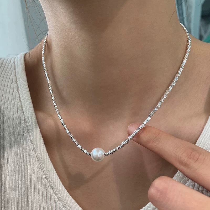 A handpicked round freshwater pearl serves as the focal point, with soft pearl luster creating a gentle contrast against the cool silver chain. The single-pearl design is minimalist yet striking, elevating sophistication with every lift of your hand or bow of your head.