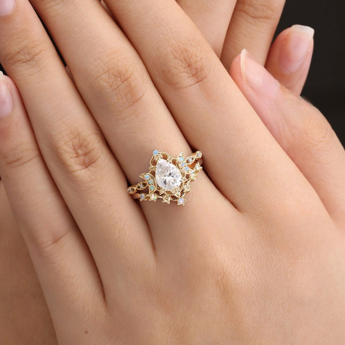 Vintage Moon-Star Teardrop Diamond Ring - S925 Silver Plated 18K Gold Opal Light Luxury Band