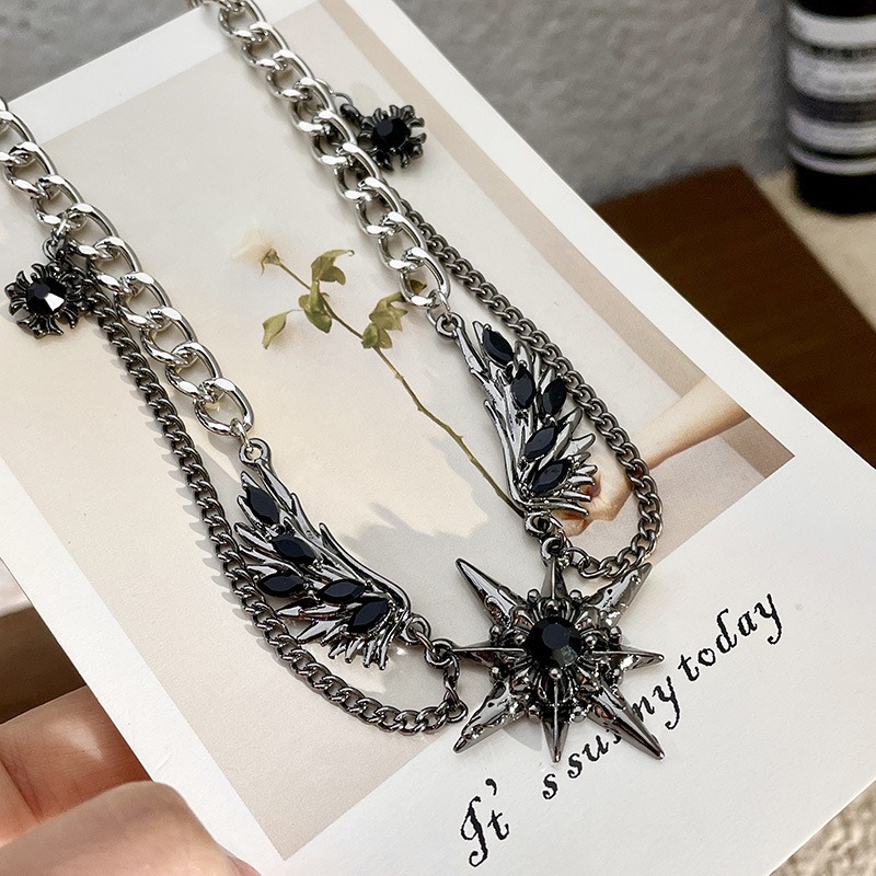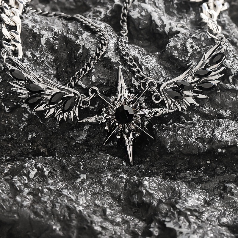 The necklace features a double-chain structure, centered with a starburst pendant and flanked by wing accents:
